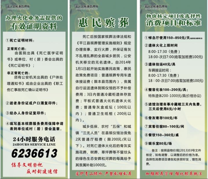 2、业务办理:在服务大厅收费窗口审查《平江县城乡居民基本殡葬服务费用保障申请表》交收有关费用,开具火化通知单及火化证明。