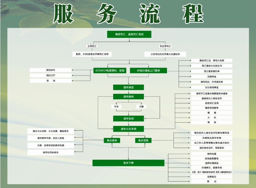 3、业务登记:在火化车间办理登记死者身份证或户口薄(验证有效死亡证明并核实身份与遗体相符)、经办人有效证件,填制结算单、火化工作人员签字、经办人签字。