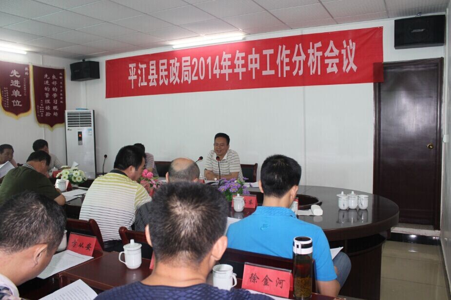 7月24日—25日,县民政局召开2014年年中工作分析会。全体局党组成员,股室、二级机构负责人参加会议,会议由局党组副书记、副局长唐建军、徐百鸣主持。
