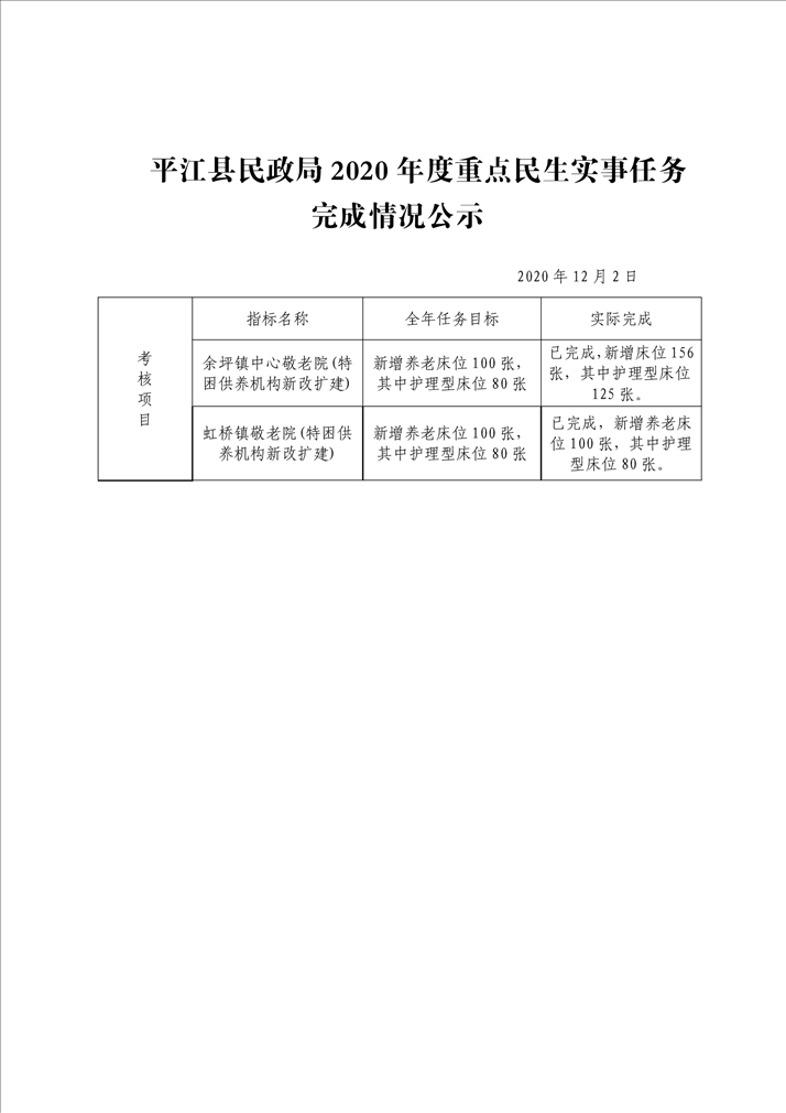 平江县民政局2020年度重点民生实事任务完成情况公示