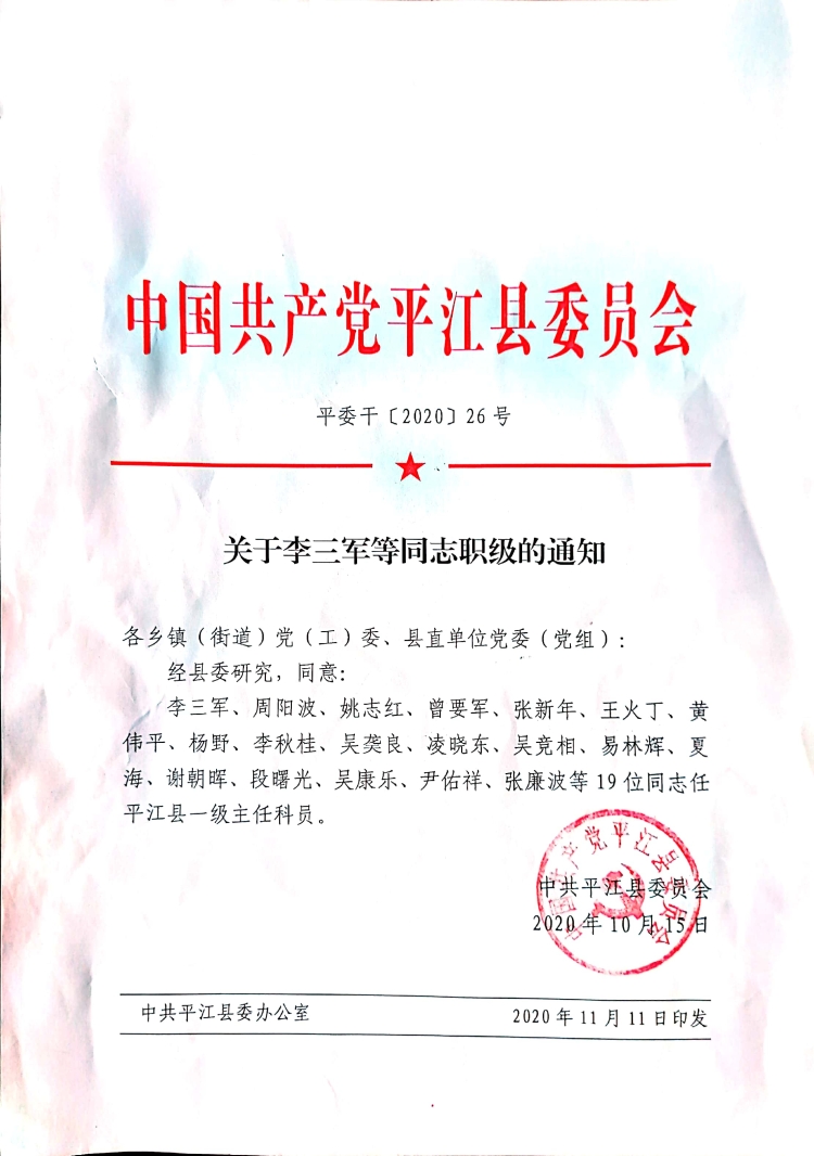 《关于李三军等同志职级的通知》(平委干{2020}26、27号文件)