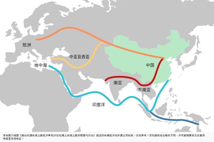 「一带一路」将通过五个走向贯穿亚欧非大陆。当中丝绸之路经济带重点畅通(1)中国经中亚丶俄罗斯至欧洲;(2)中国经中亚丶西亚至中东丶地中海;(3)中国至东南亚丶南亚丶印度洋。而21世纪海上丝绸之路则重点(4)从中国沿海港口过南海到印度洋,延伸至欧洲;和(5)从中国沿海港口过南海到南太平洋。