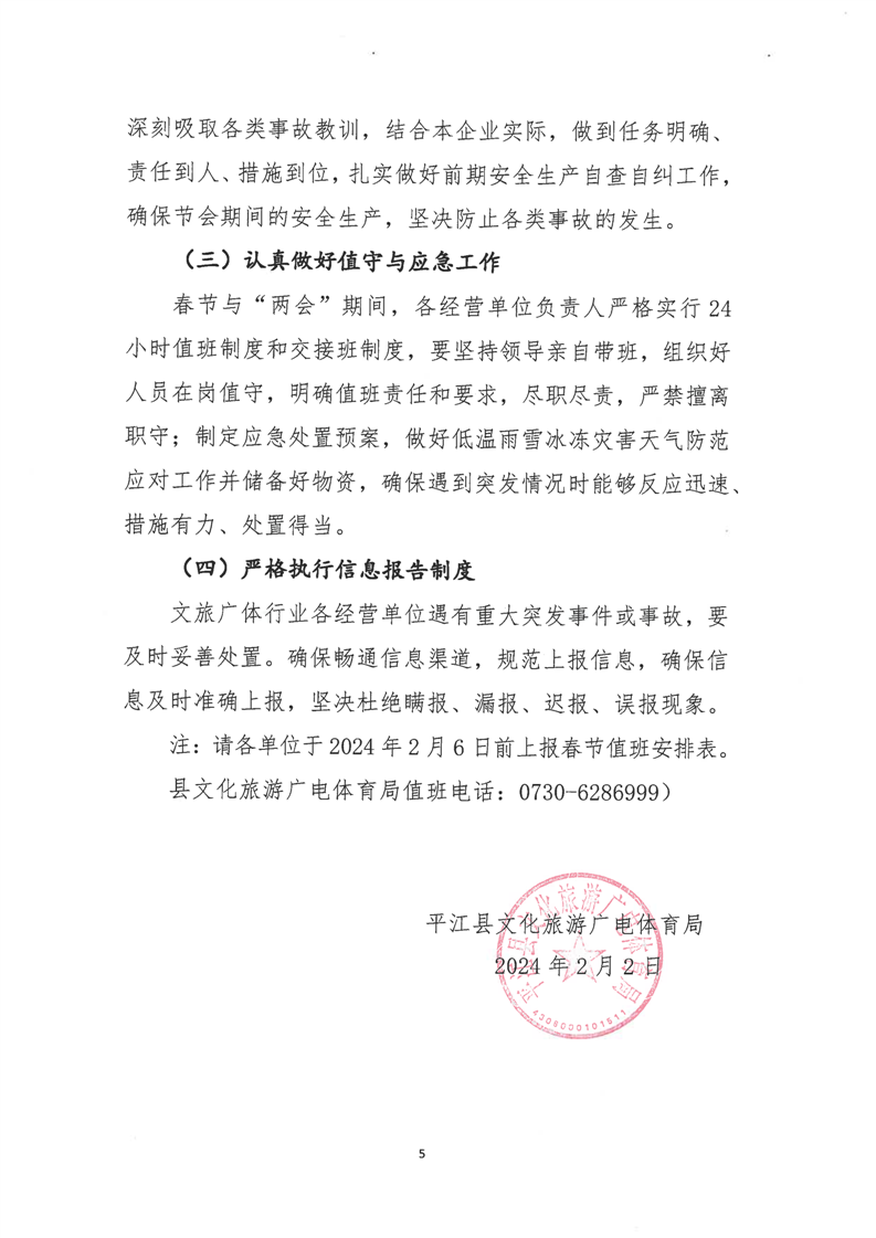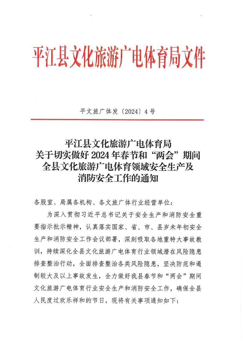 平江县文化旅游广电体育局关于切实做好2024年春节和“两会”期间全县文化旅游广电体育领域安全生产及消防安全工作的通知