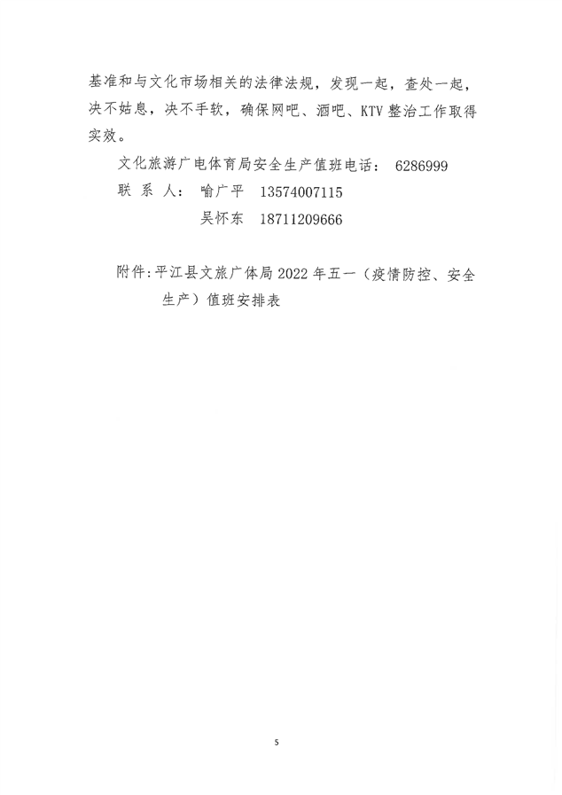 关于印发《平江县文化旅游广电体育局2022年“五一”假期期间安全生产、疫情防控和“利剑护蕾”行动工作实施方案》的通知