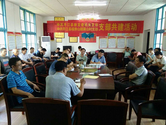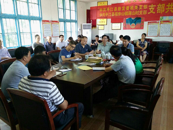为积极创新开展“两学一做”学习教育,加强基层党组织建设,进一步提高党支部的创造力、凝聚力、战斗力,7月7日下午,旅发委全体党员干部来到福寿山镇蒋山村开展“支部共建聚合力,旅游帮扶促脱贫”活动。
