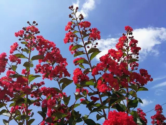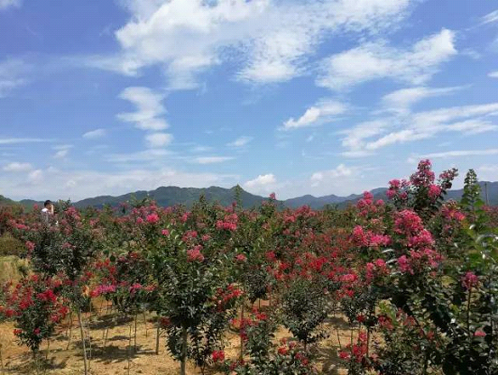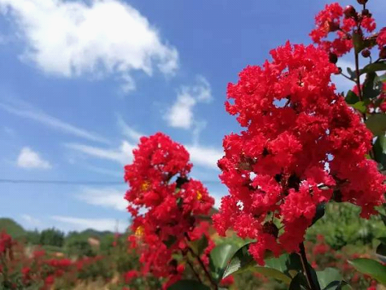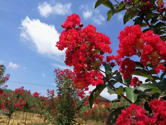 在西江村的万花园基地,大红色、玫红色的紫薇花璀璨艳丽,成了一片红彤彤的花海。一簇簇、一丛丛,如云似锦,迎风怒放,花香四溢,和蓝天白云相互映衬,构成了色彩明艳的美丽画面。盛开的紫薇花吸引了众多游人前来赏花,大家穿梭在花丛中,拍照留念,体验乡村风情,玩的不亦乐乎。