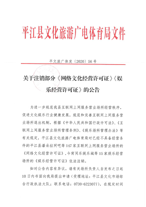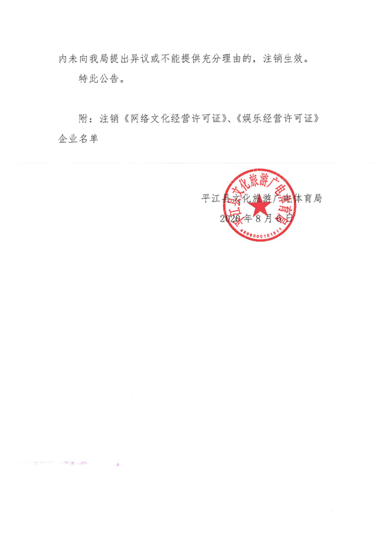 关于注销部分《网络文化经营许可证》《娱乐经营许可证》的公告