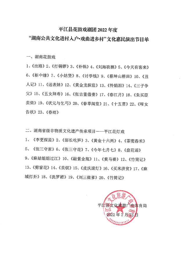 平江县花鼓戏剧团2022年度“湖南公共文化进村入户-戏曲进乡村”文化惠民演出节目单