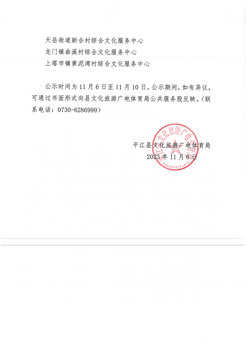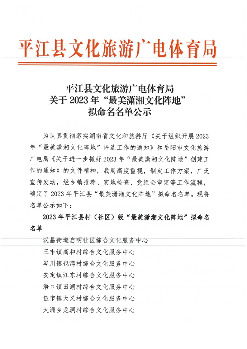 平江县文化旅游广电体育局关于2023年“最美潇湘文化阵地”拟命名名单公示