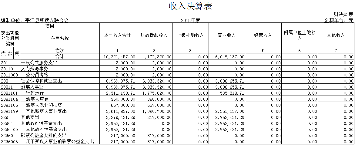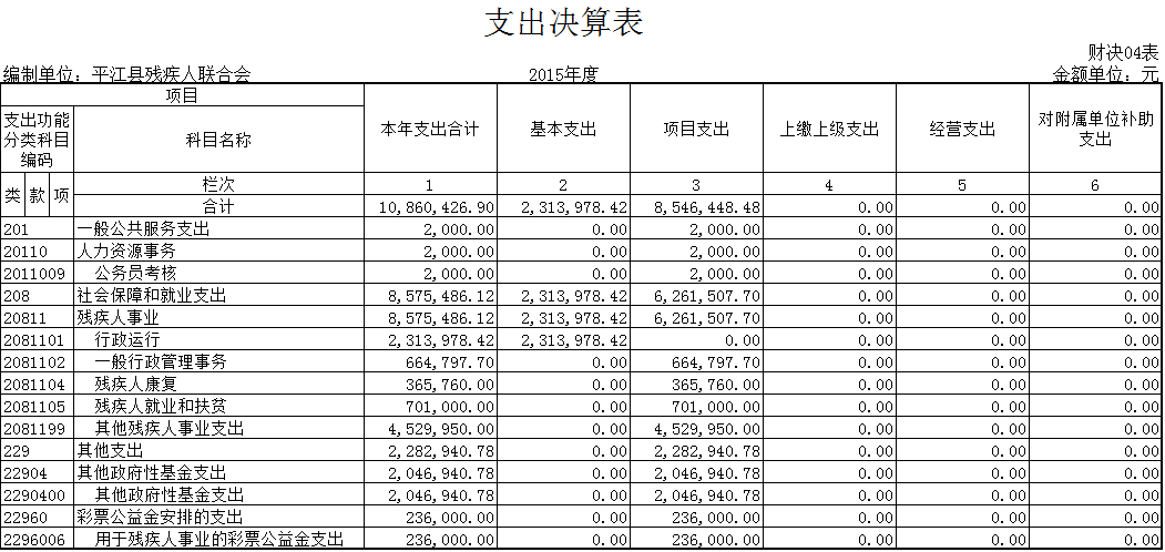 上年结转2509056.41,其中:财政补助结转623469非财政补助结转1882747.7;本年收入10221457元,其中财政补助收入4172320元,事业收入6049137(其中:保障金收入3498000元、 捐赠收入2551137).总支出10860426.9元,其中事业基本支出2313978.42元,占总支出比率21.31%,项目支出8546448.48元, 占总支出比率78.69%,年末结转1870086.51元,大部分属跨年应付未付的残人事业项目费用,其中财政补助结转594409元、非财政补助结转1275677.51元。 根据年初预算,本着厉行节约,量入为出的原则,费用支出严格控制,专项资金专款专用,责任明确,使有限的资金实现最大的社会效益。