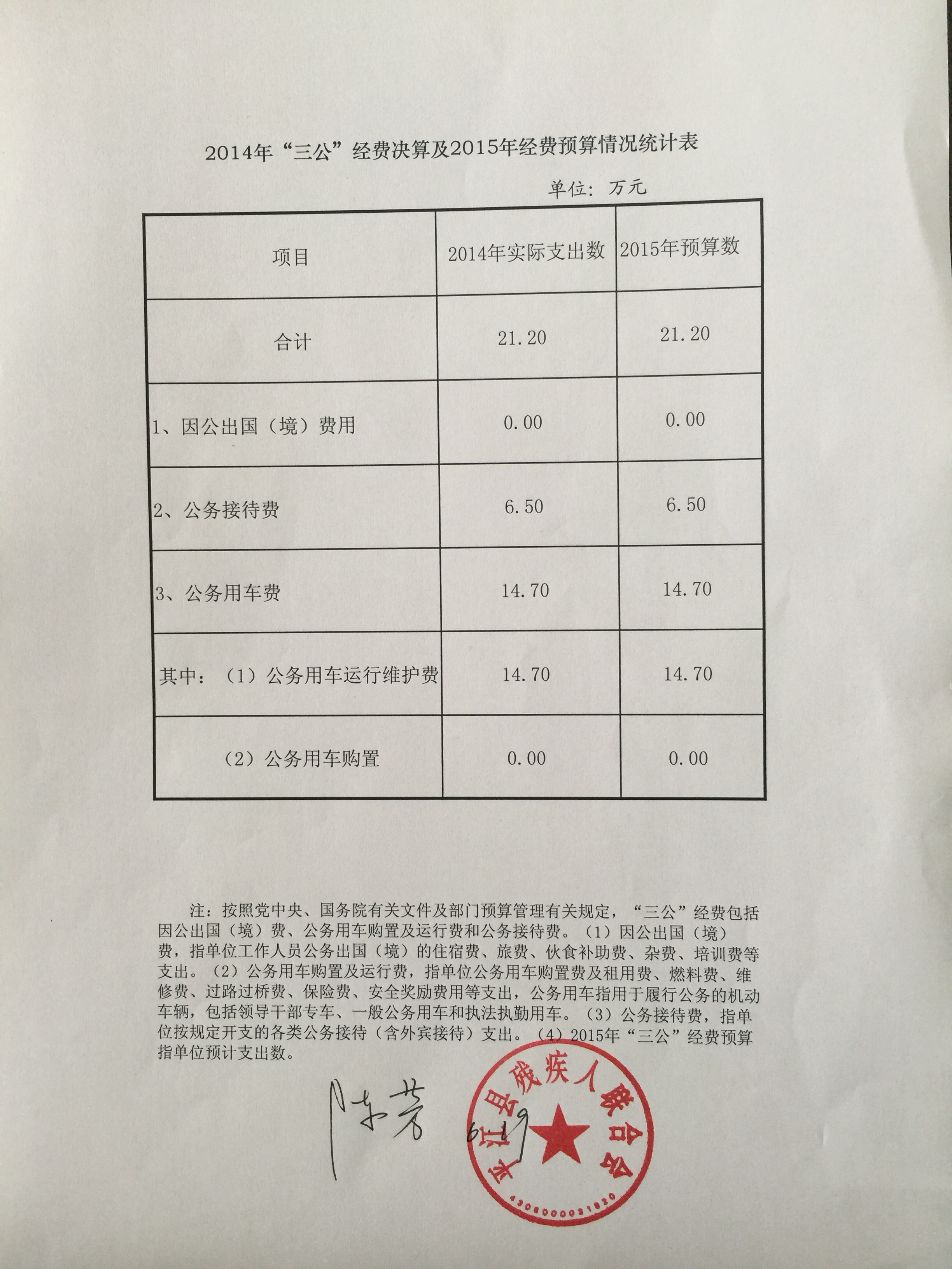平江县残联2014年“三公”经费决算及2015年经费预算情况统计表