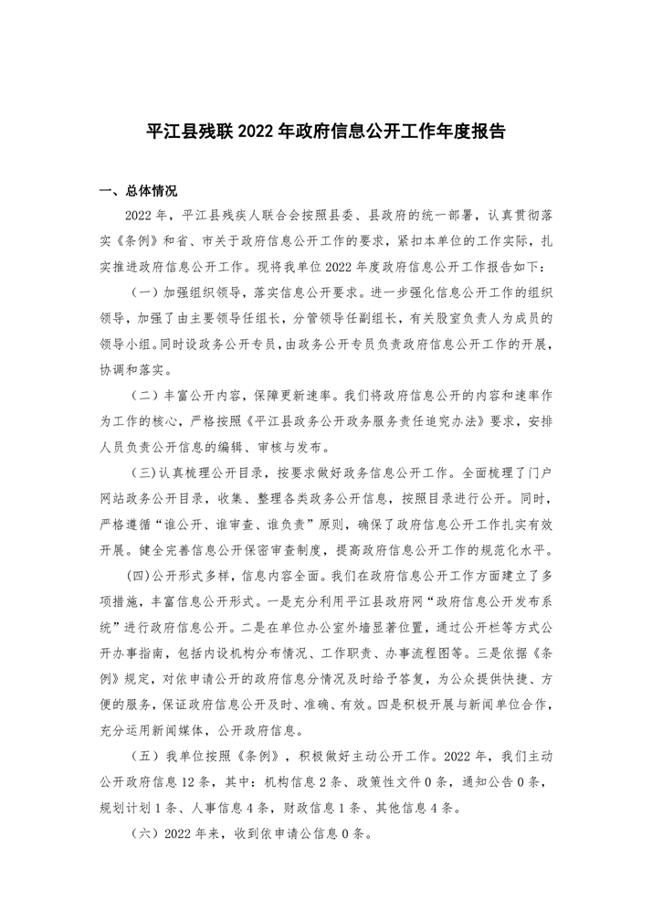平江县残联2022年度政府信息公开工作年度报告