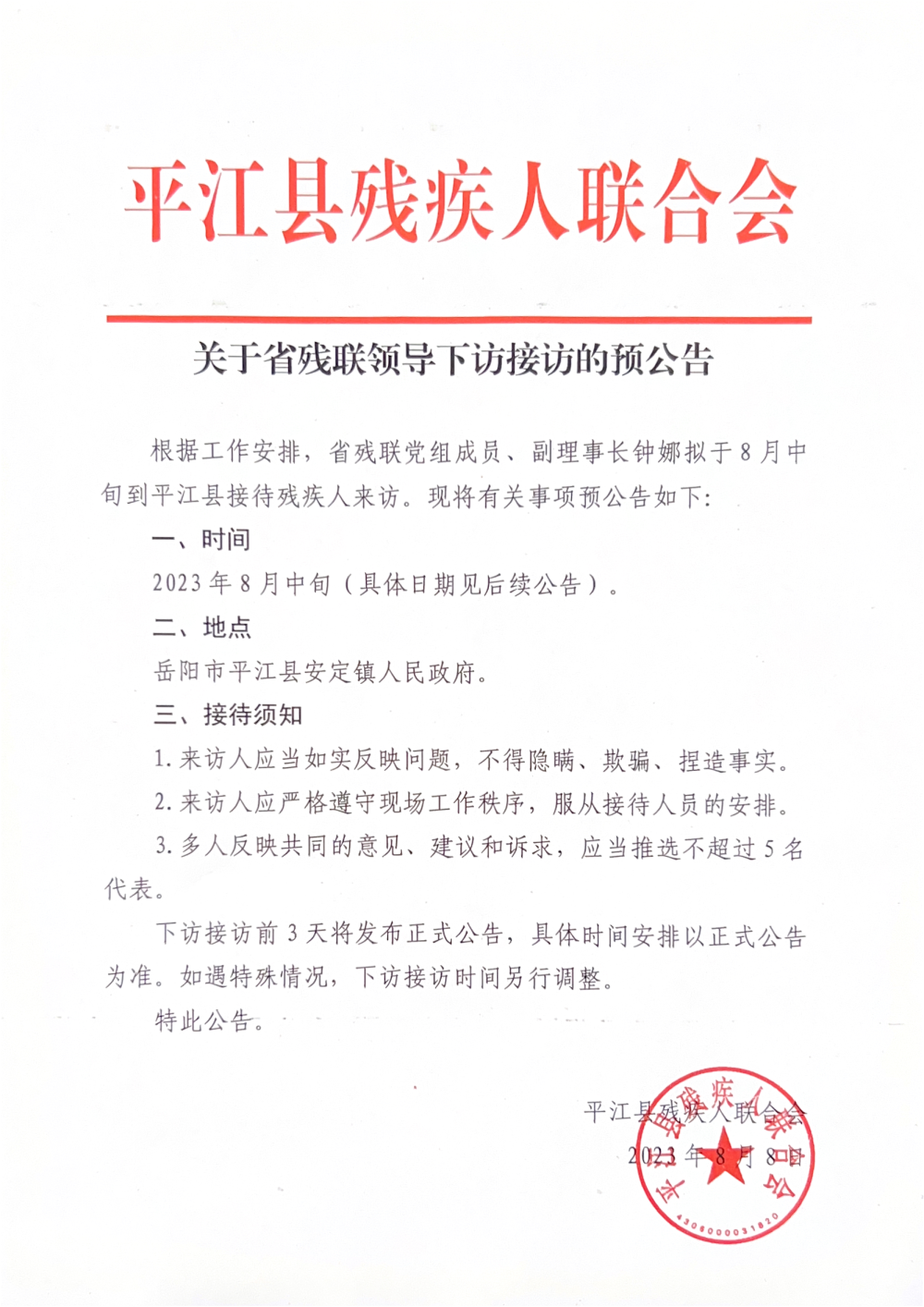 关于省残联领导下访接访的预公告