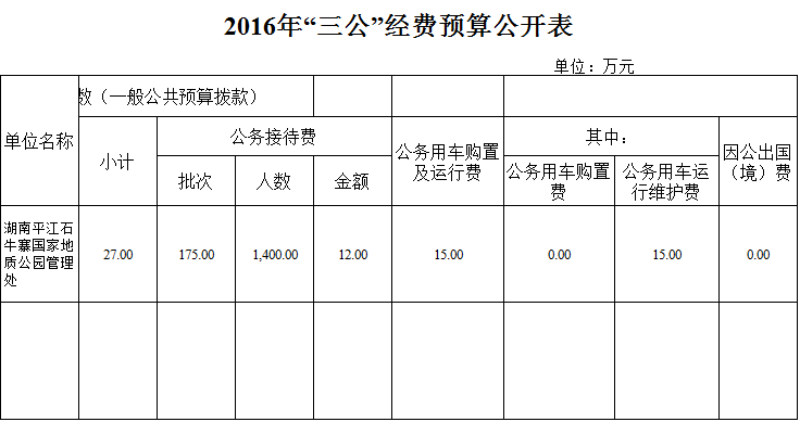 平江县石牛寨地质公园2016年度三公经费预算公开表