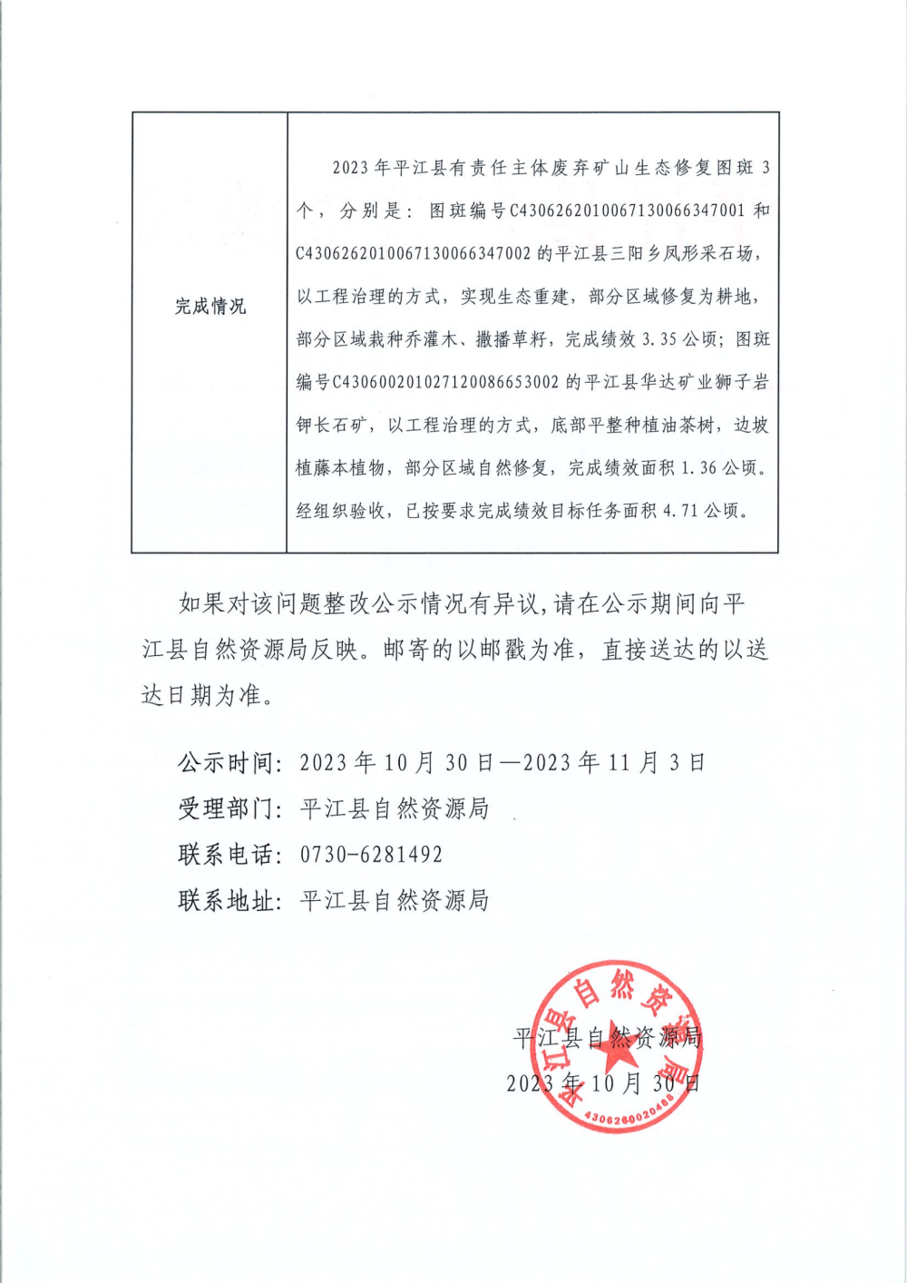 关于落实平江县2023年污染防治攻坚战“夏季攻势”有责任主体废弃矿山生态修复治理任务的公示