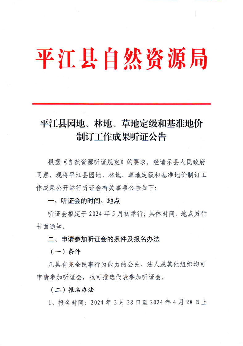 平江县园地、林地、草地定级和基准地价制订工作成果听证公告