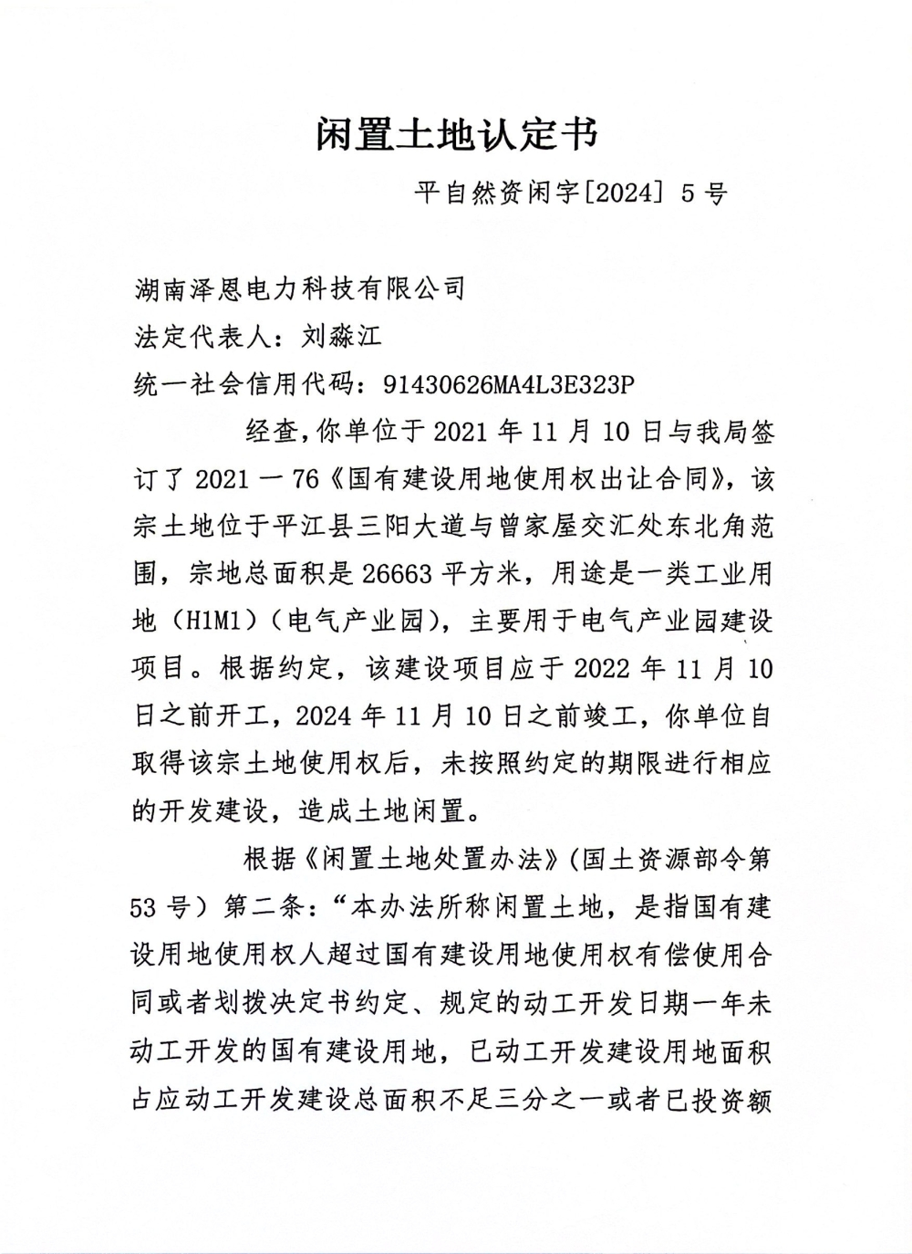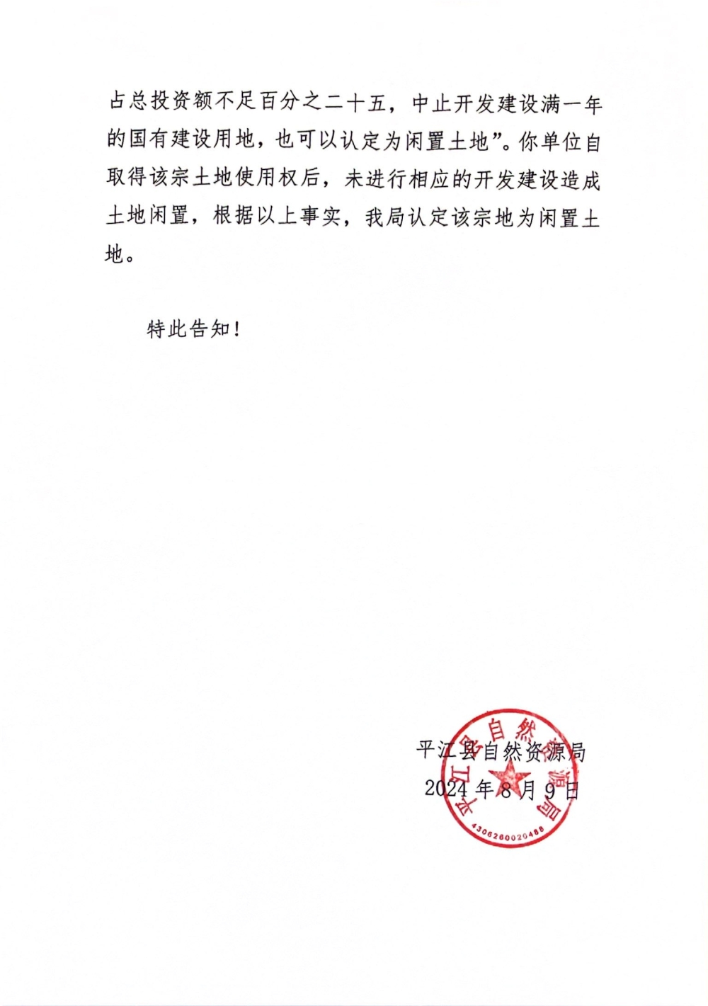 闲置土地认定书--平自然资闲字【2024】5号