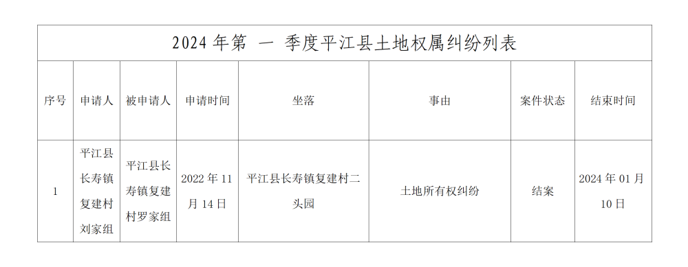 2024年第 一 季度平江县土地权属纠纷