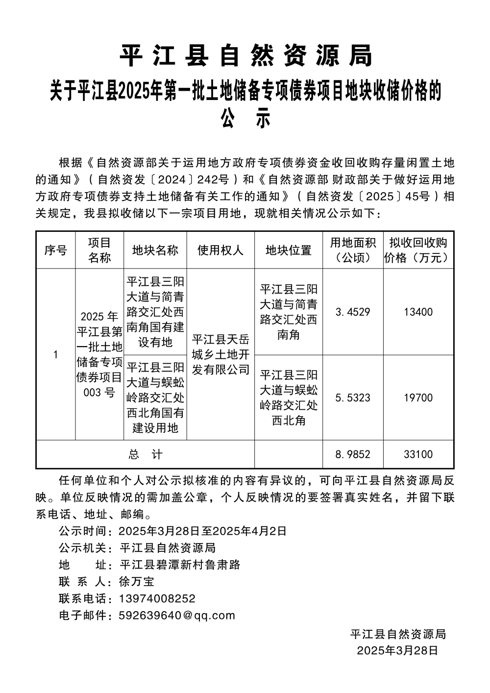 平江县自然资源局关于平江县2025年第一批土地储备专项债券项目地块收储价格的公示