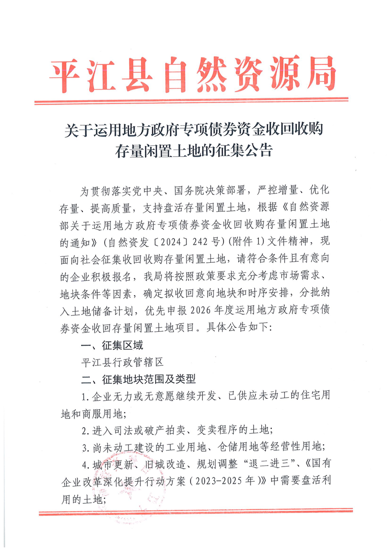 3、平江县自然资源局关于运用地方政府专项债券资金收回收购存量闲置土地的征集公告.pdf
