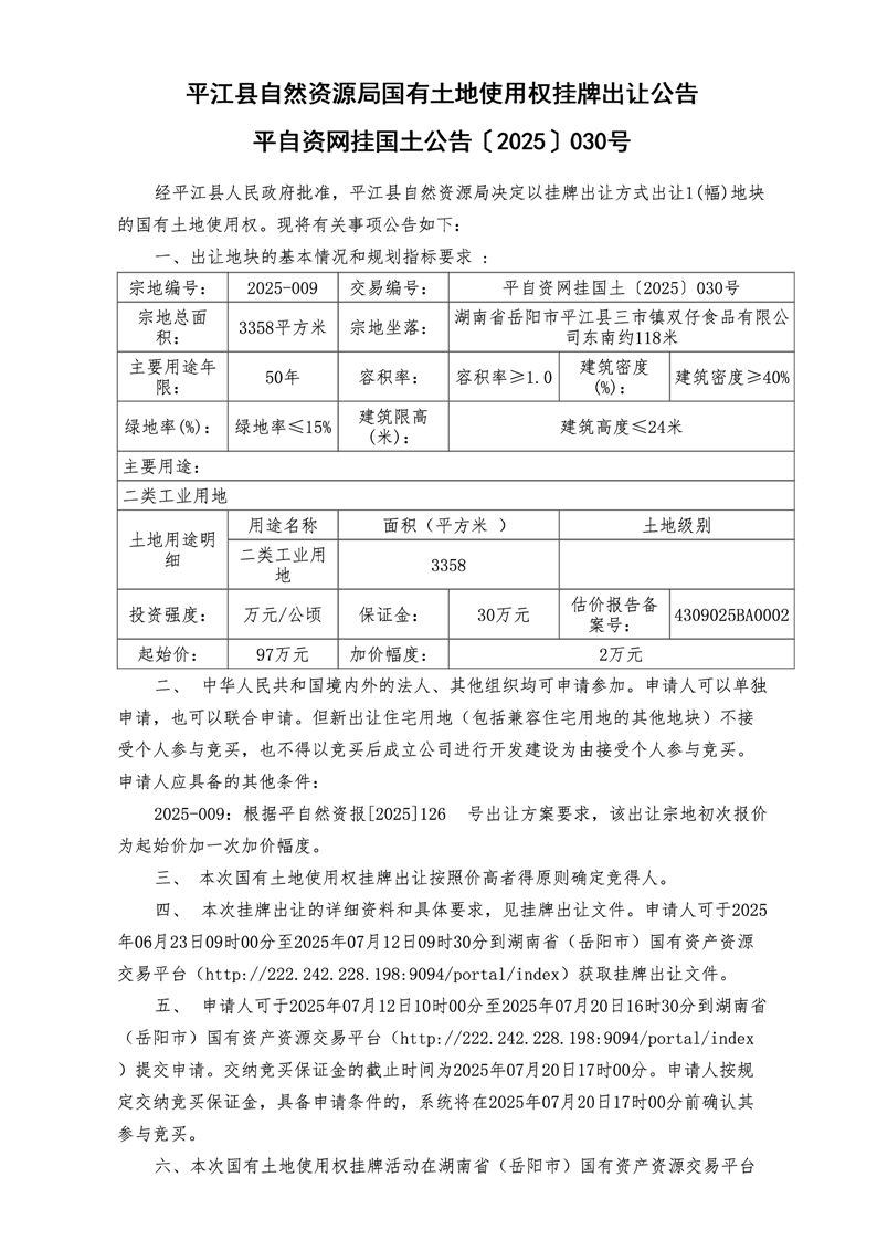 平自资网挂国土公告〔2025〕030号