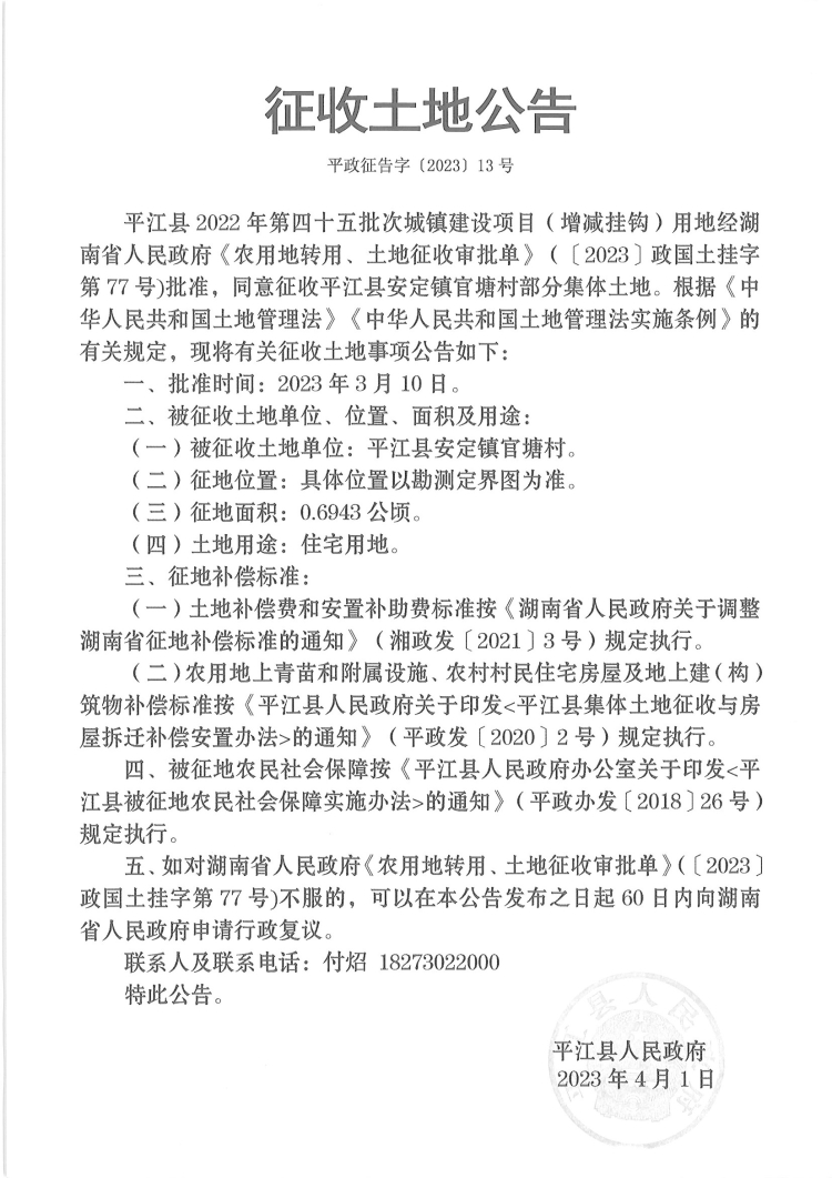 平江县2022年第四十五批次城镇建设项目征收土地公告