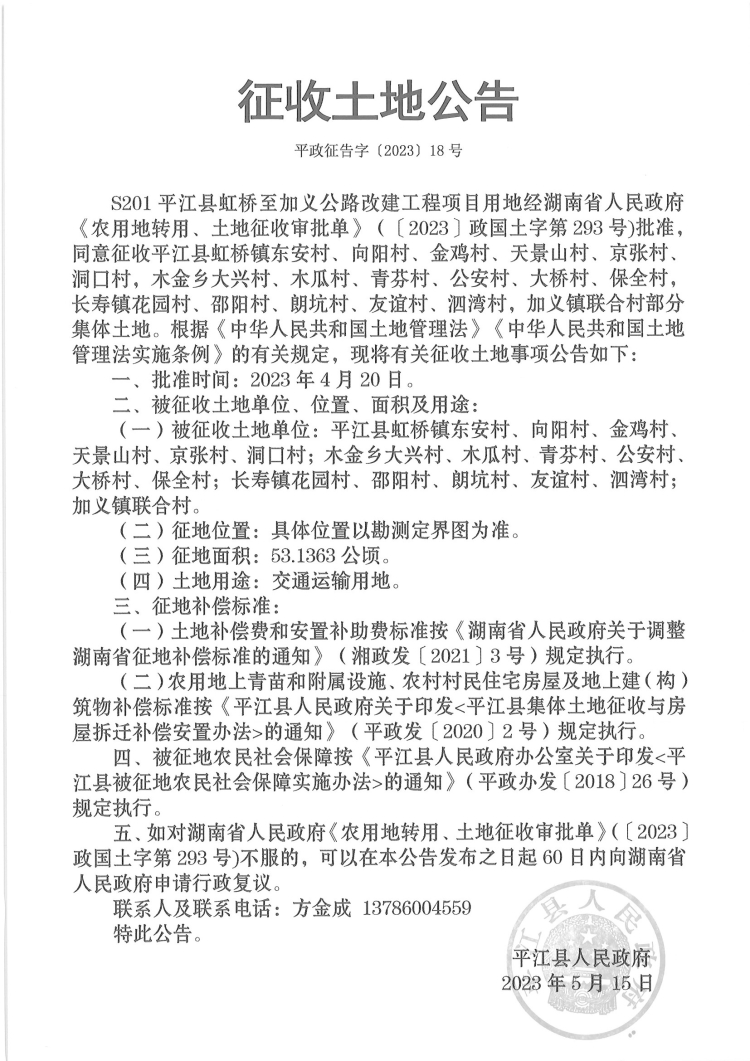 S201平江县虹桥至加义公路改建工程项目征收土地公告
