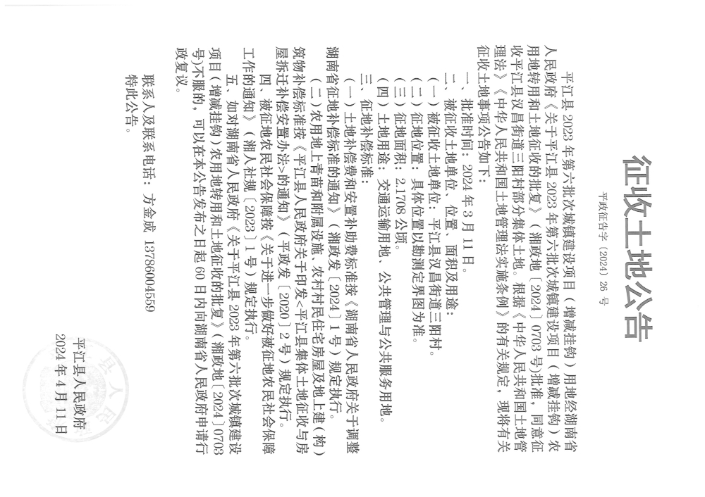 平江县2023年第六批次城镇建设项目(增减挂钩)征收土地公告