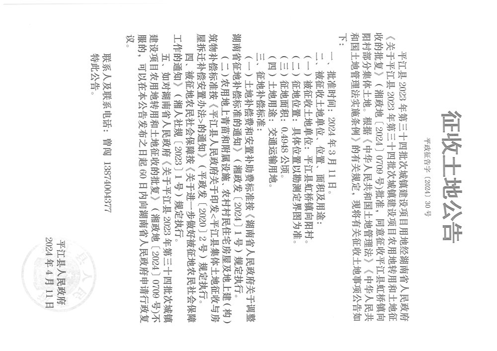 平江县2023年第三十四批次城镇建设项目征收土地公告