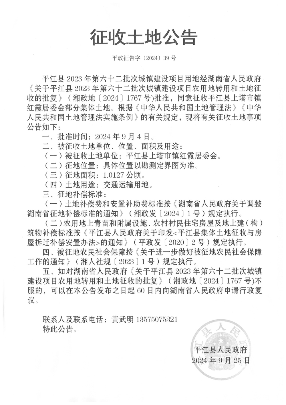 平江县2023年第六十二批次城镇建设项目征收土地公告