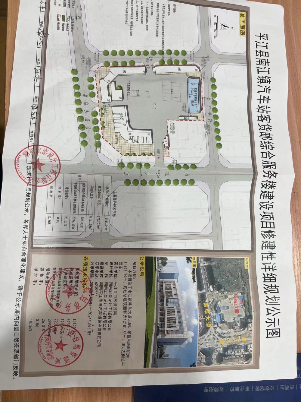 今有湖南平江华腾汽车运输有限责任公司向我局提交审查《平江县南江镇汽车站客货邮综合服务楼建设项目修建性详细规划公示》的申请。现根据《中华人民共和国行政许可法》和《中华人民共和国城乡规划法》的规定,对该项目规划依法予以公示。
