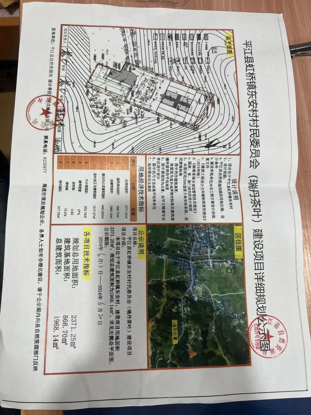 今有平江县虹桥镇东安村村民委员会向我局提交审查《平江县虹桥镇东安村村民委员会(瑞丹茶叶)建设项目修建性详细规划公示》的申请。现根据《中华人民共和国行政许可法》和《中华人民共和国城乡规划法》的规定,对该项目规划依法予以公示。