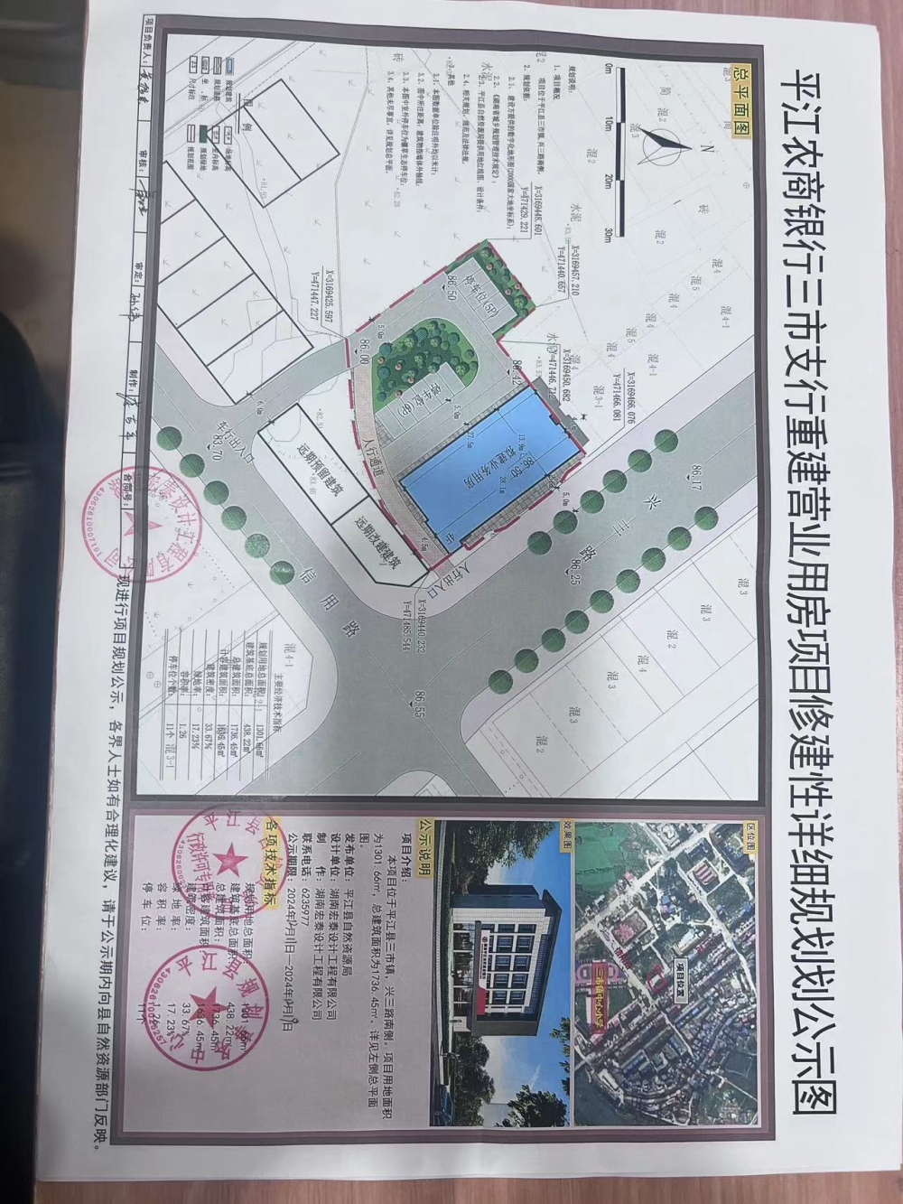 今有平江农商银行三市支行向我局提交审查《平江农商银行三市支行重建营业用房项目修建性详细规划公示》的申请。现根据《中华人民共和国行政许可法》和《中华人民共和国城乡规划法》的规定,对该项目规划依法予以公示。