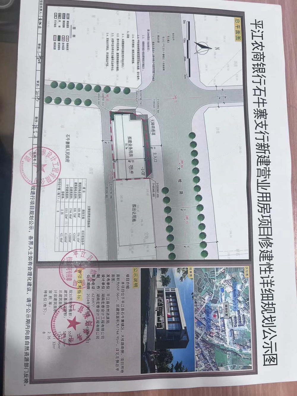 今有平江农商银行石牛寨支行向我局提交审查《平江农商银行石牛寨支行新建营业用房项目修建性详细规划公示》的申请。现根据《中华人民共和国行政许可法》和《中华人民共和国城乡规划法》的规定,对该项目规划依法予以公示。
