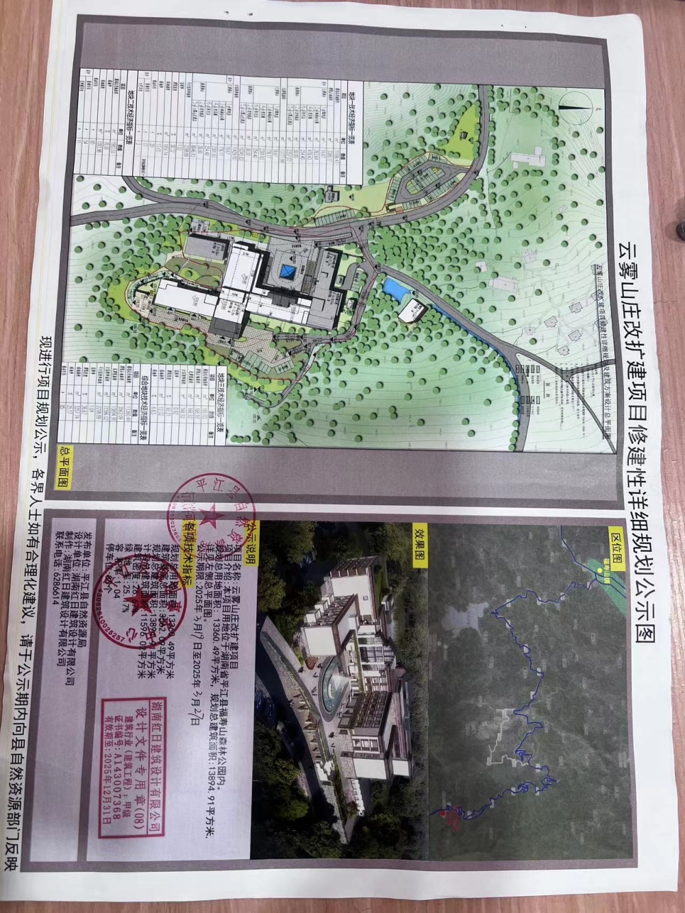今有平江县岳泰福寿山旅游开发有限公司向我局提交审查《云雾山庄改扩建项目修建性详细规划公示》的申请。现根据《中华人民共和国行政许可法》和《中华人民共和国城乡规划法》的规定,对该项目规划依法予以公示。