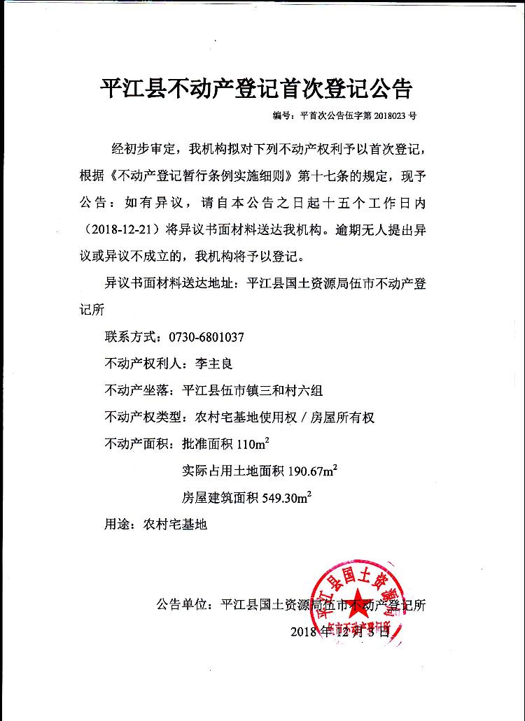 江来宜 汪芬芳 不动产首次登记公告 伍字第2018024