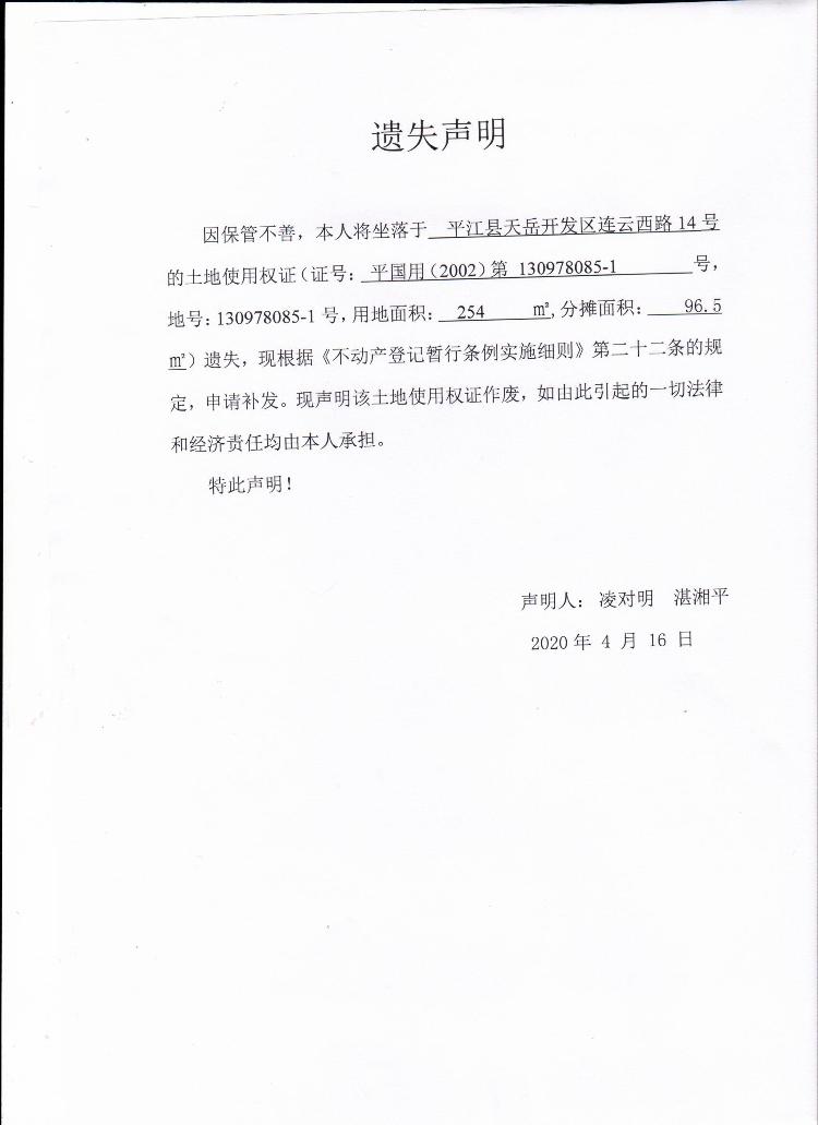 凌对明 湛湘平国土证遗失声明