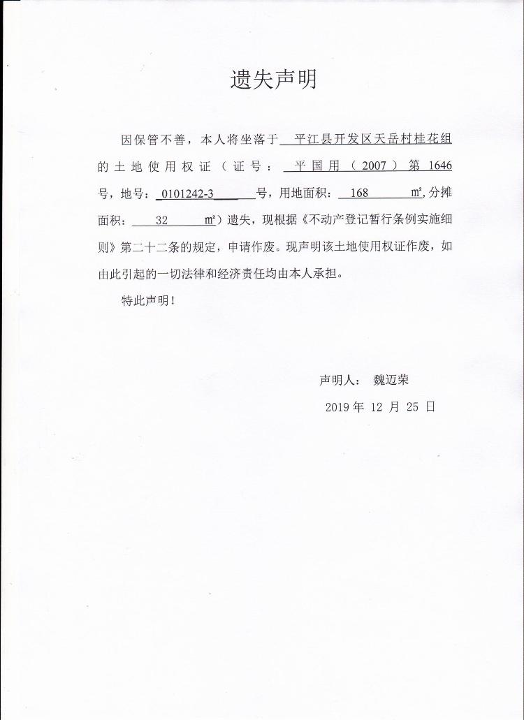 魏迈荣国有土地使用权证遗失声明