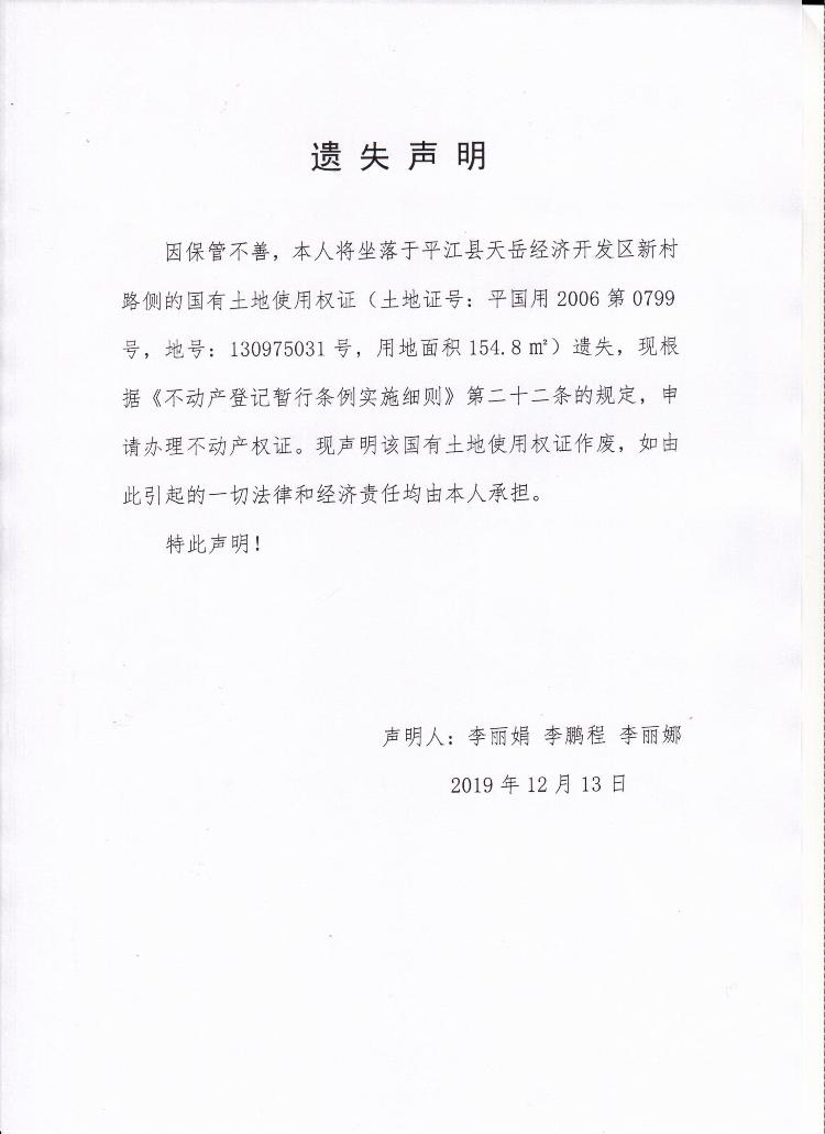 李丽娟 李鹏程 李丽娜国土证遗失声明
