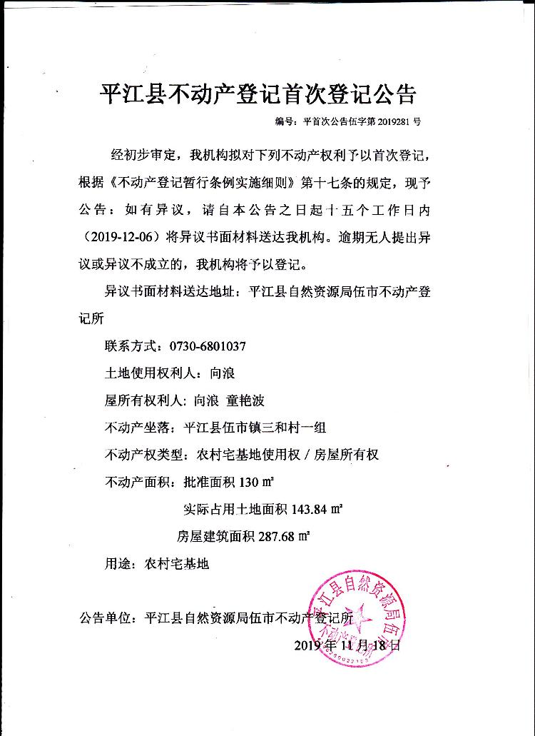 向浪 童艳波 平江县不动产首次登记公告 伍字第2019281号