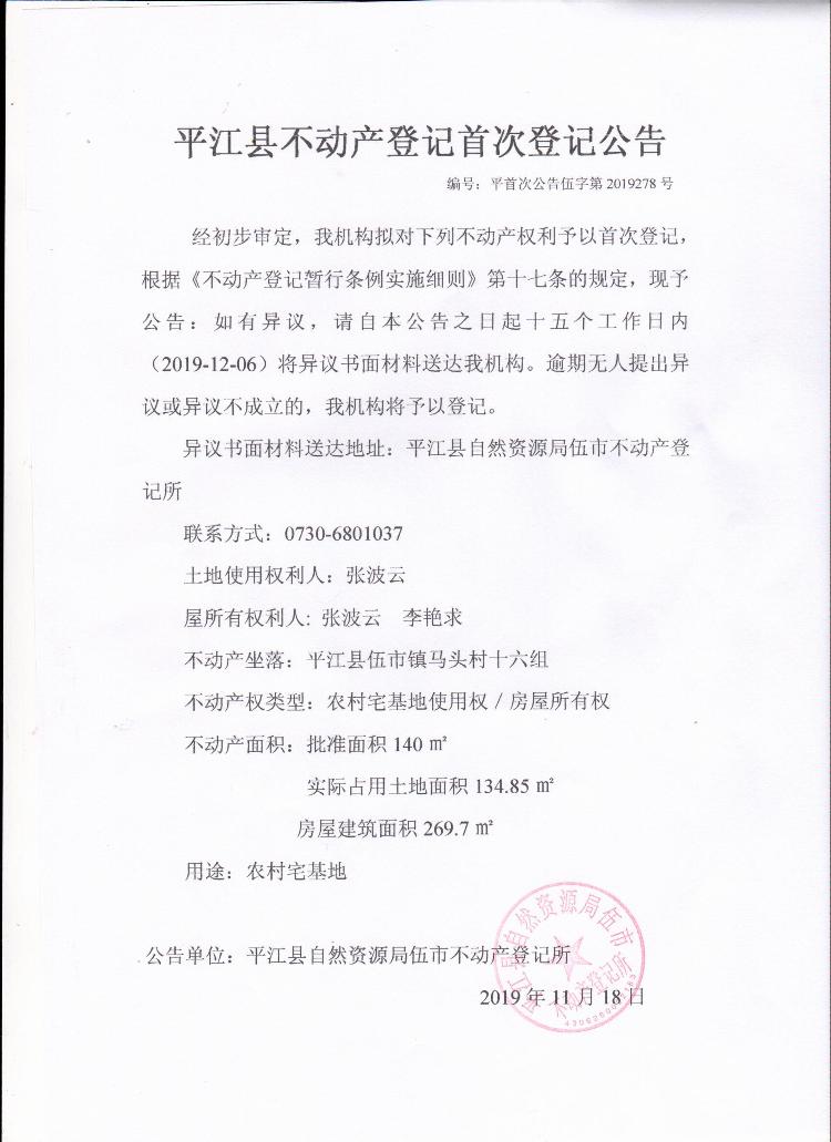 张波云 李艳球 平江县不动产首次登记公告 伍字第2019278号