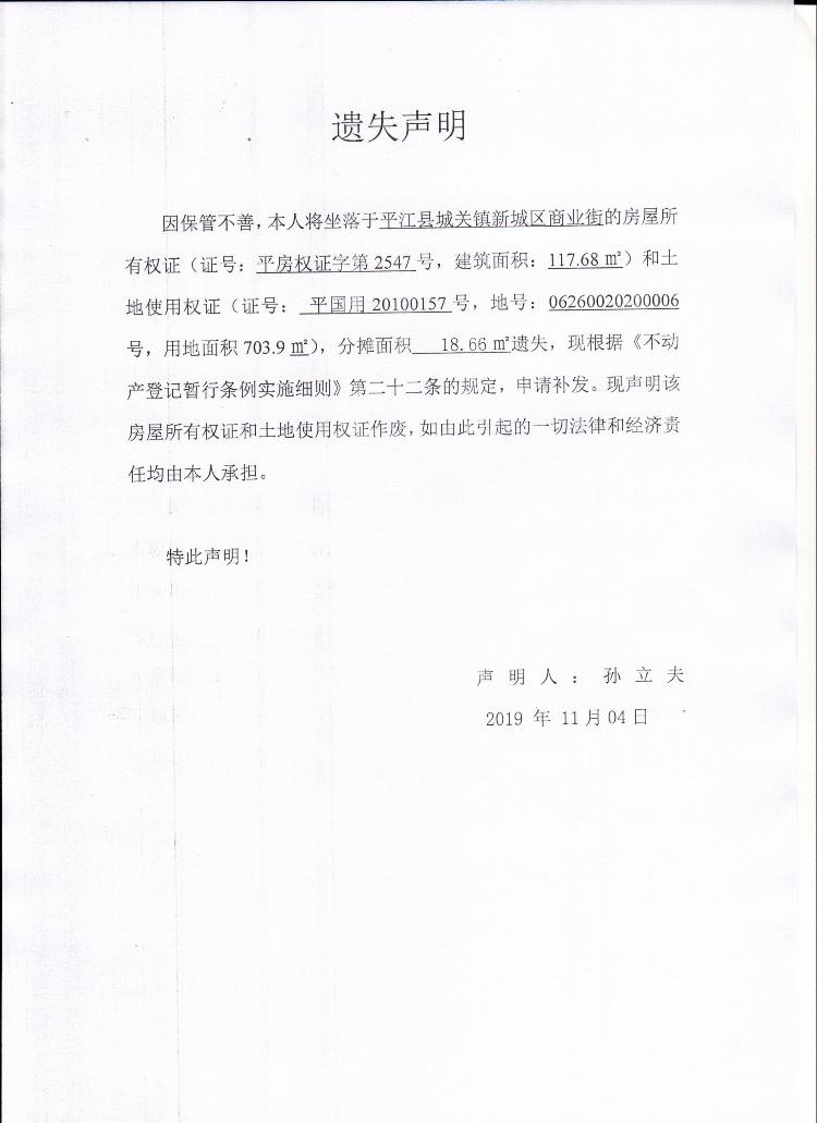 孙立夫房屋所有权证和国土证遗失声明