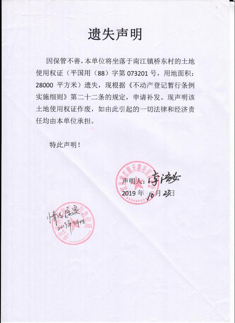 平江县非金属矿矿部土地证遗失声明