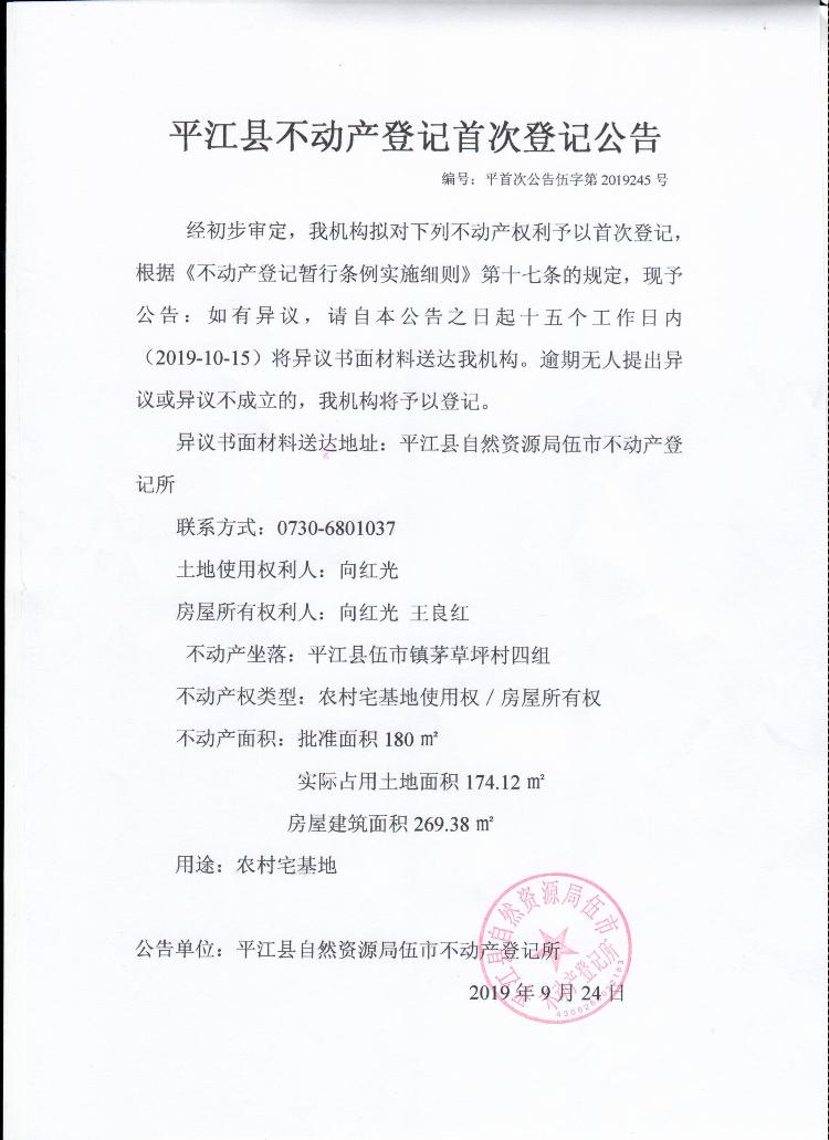 向红光 王良红 平江县不动产首次登记公告 伍字第2019245号