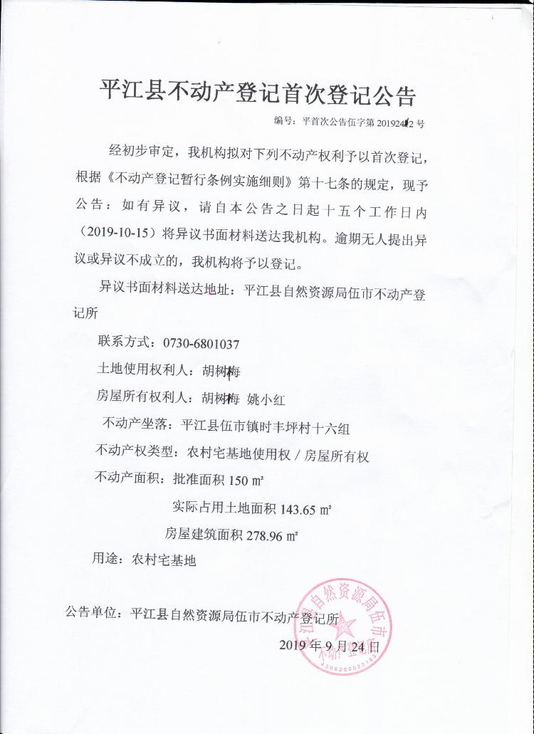 胡树梅 姚小红 不动产首次登记公告 伍字第2019242号