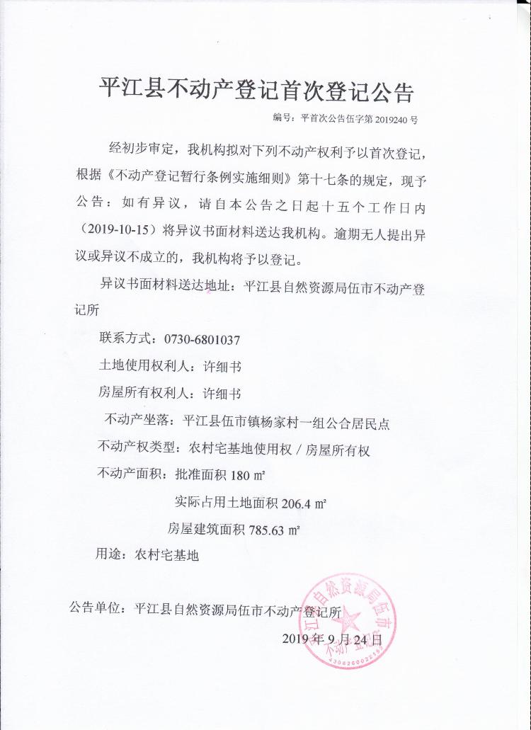 许细书 平江县不动产首次登记公告 伍字第2019240号