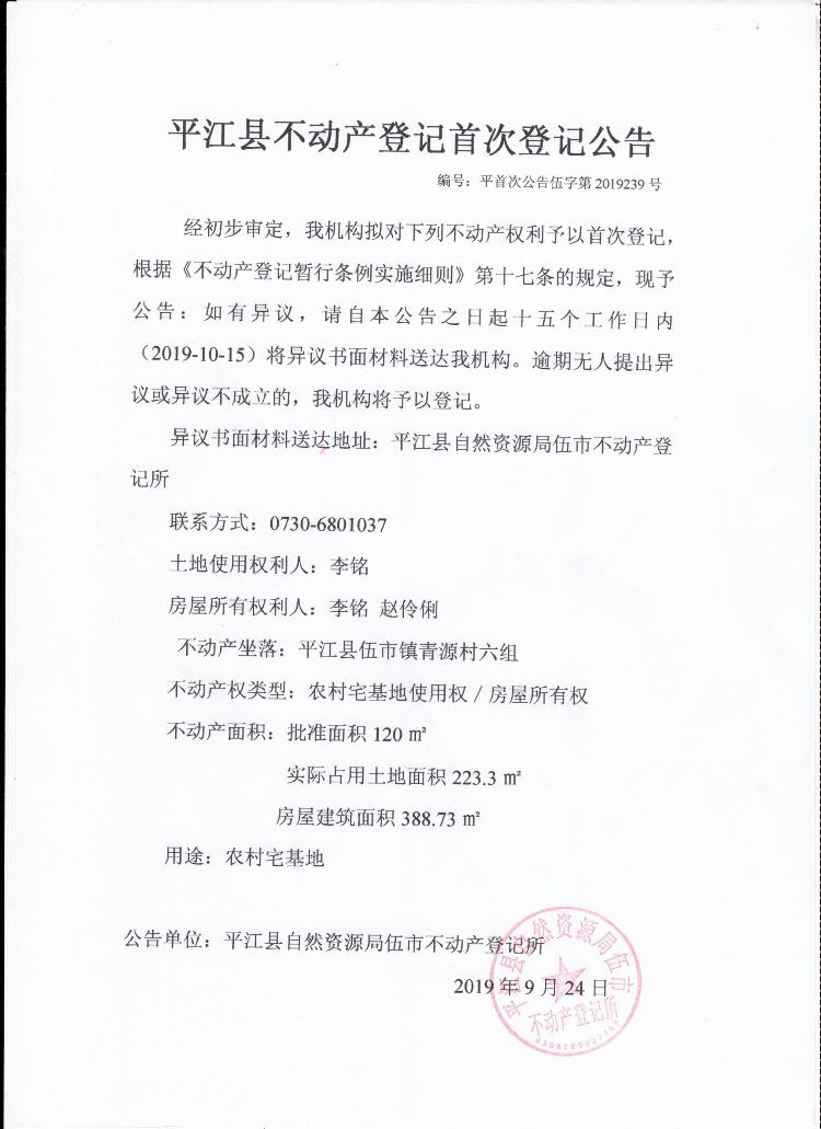 李铭 赵伶俐 平江县不动产首次登记公告 伍字第2019239号