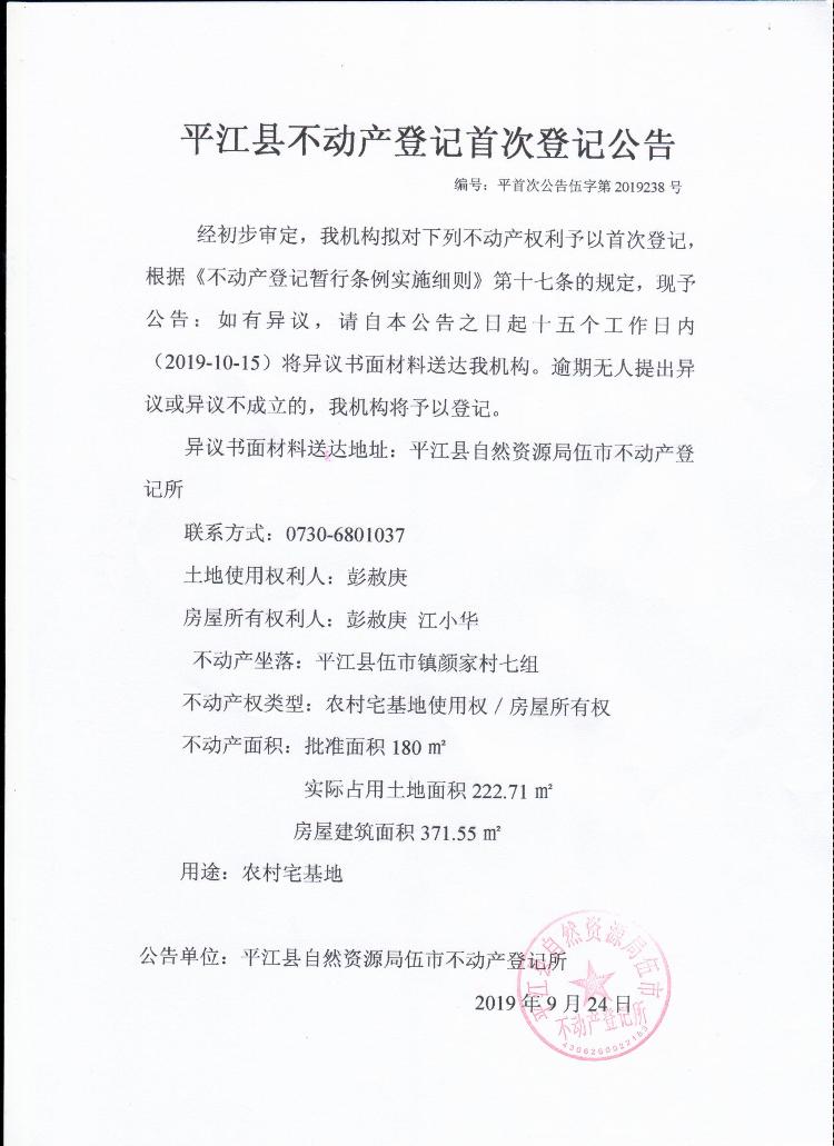 彭赦庚 江小华 平江县不动产首次登记公告 伍字第2019238号