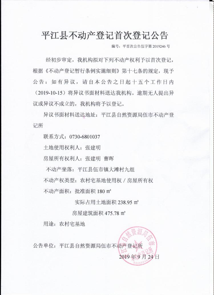 张建明 曹晖 平江县不动产首次登记公告 伍字第20190246号