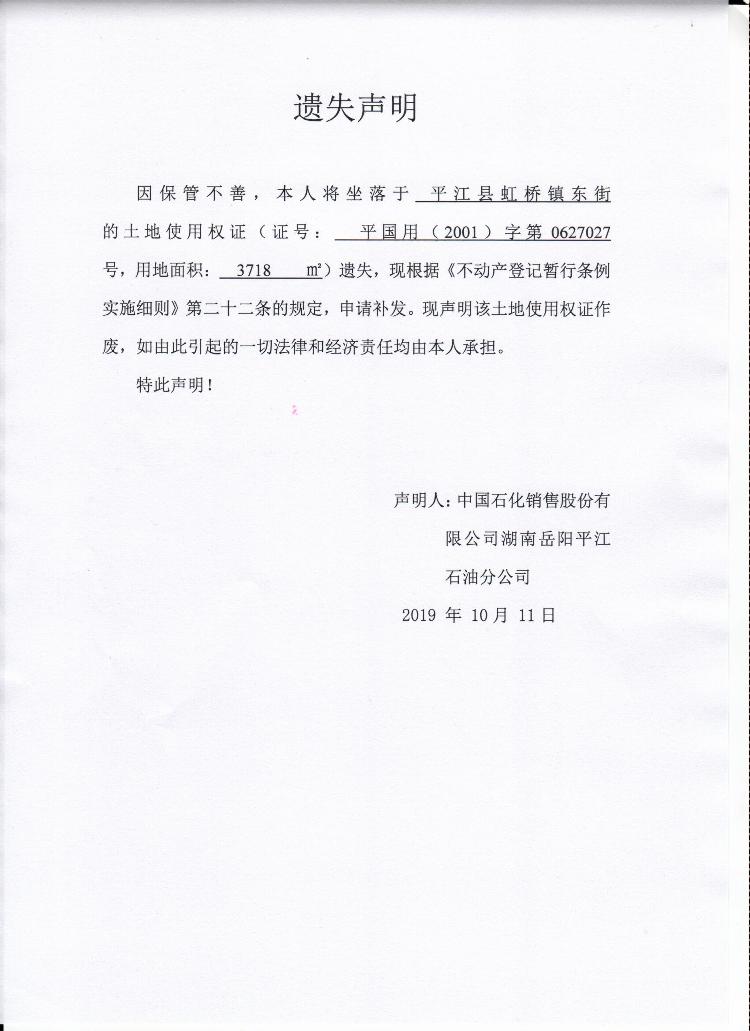 中国石化销售股份有限公司湖南岳阳平江石油分公司土地使用权证遗失声明.jpeg
